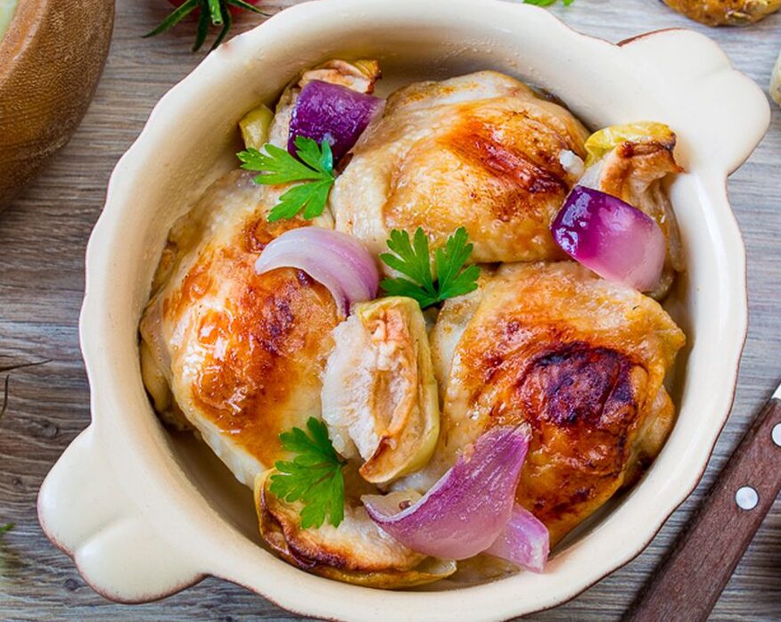 Запечені курячі стегна з кисло-солодкими яблуками та цибулею – страва, яка поєднує ніжне м’ясо курячих стегон і кисло-солодкі яблука, що робить її не тільки смачною, а й оригінальною. Яблука додають м’ясу свіжий фруктовий відтінок, а запечена червона цибуля підсилює аромат і надає легку солодкість. Цей рецепт стане чудовим рішенням, коли хочеться додати різноманітності в меню і приготувати щось нове та смачне.